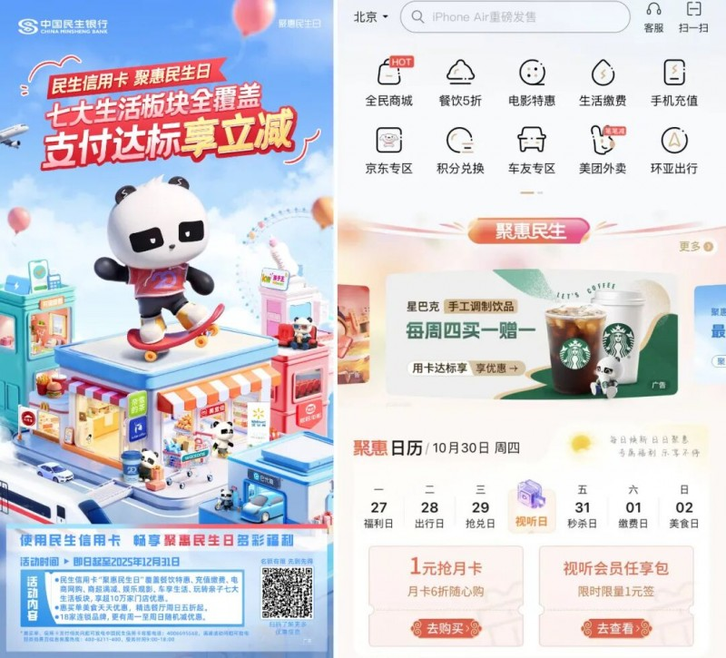 其中,中国民生银行信用卡中心(以下简称“民生信用卡中心”)与京东、抖音、支付宝、携程等头部平台联动,推出“一键绑卡赠支付礼包”和“聚惠民生日”活动。