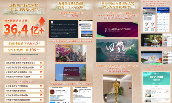 《四海中医》自开播以来,便以破竹之势席卷海内外传播平台,引发广泛关注与深度共鸣。节目上线全球180余个国家和地区,全网累计总传播量突破36亿,全站讨论量87.43万,登陆全平台热搜109次,持续位居微博综艺热度榜、爱奇艺纪录片热度榜等榜单前列。更值得关注的是其在品质与口碑上获得的双重认可,进入了《豆瓣2025评分最高纪录剧集》榜单。