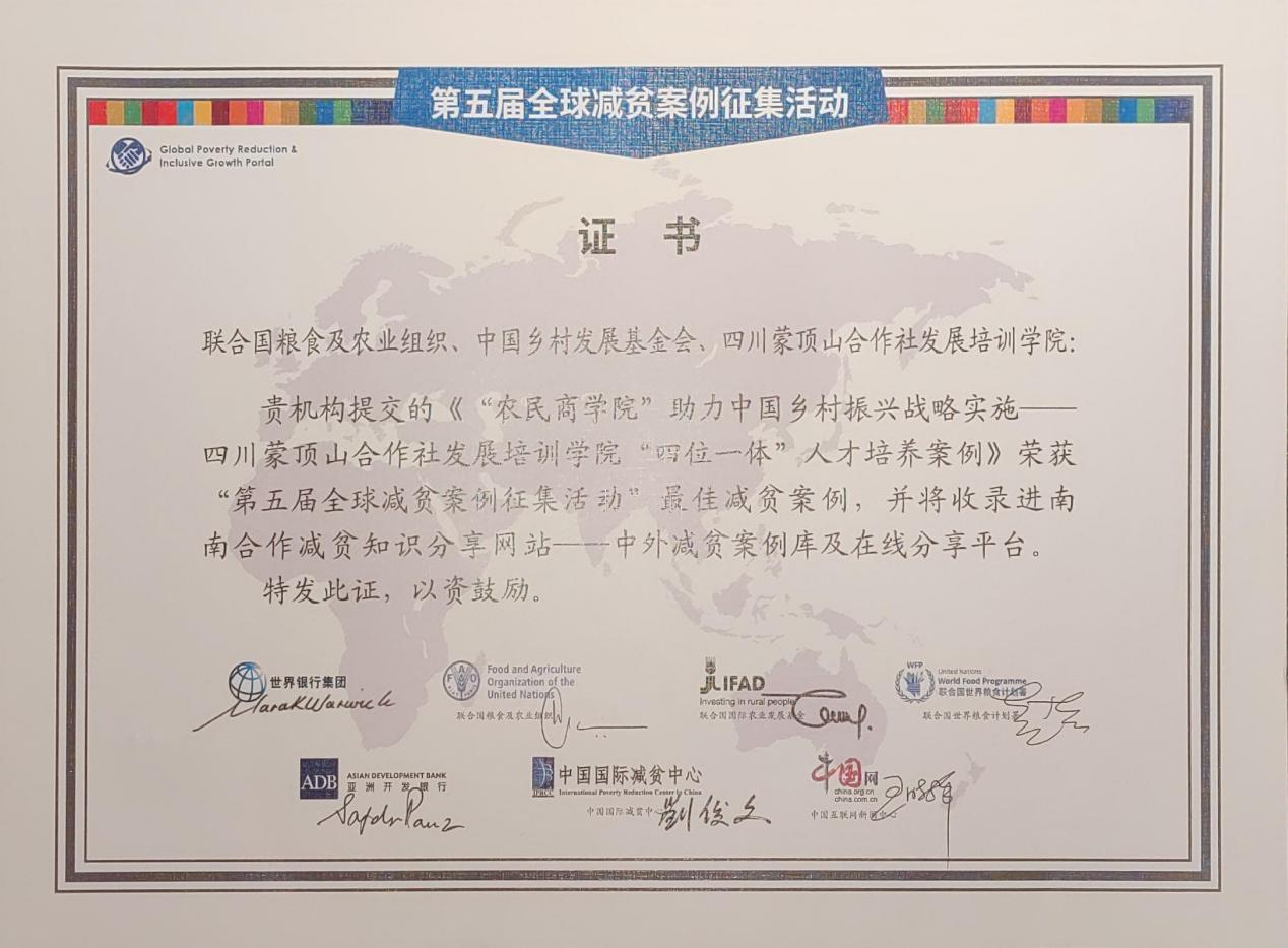会上,联合国粮食及农业组织、联合国世界粮食计划署、世界银行、国际农业发展基金、亚洲开发银行、中国国际扶贫中心、中国互联网新闻中心联合发布了“第五届全球减贫案例征集活动”最佳减贫案例。《“农民商学院”助力中国乡村振兴战略实施——四川蒙顶山合作社发展培训学院“四位一体”人才培养案例》荣获“第五届全球减贫案例征集活动”最佳减贫案例,并将收录进南南合作减贫知识分享网站——中外减贫案例库及在线分享平台。