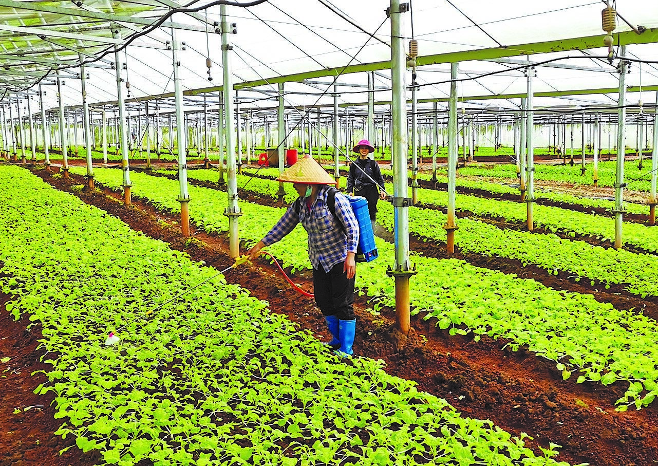 信义龙湾蔬菜种植基地的工人正在进行喷水作业。
