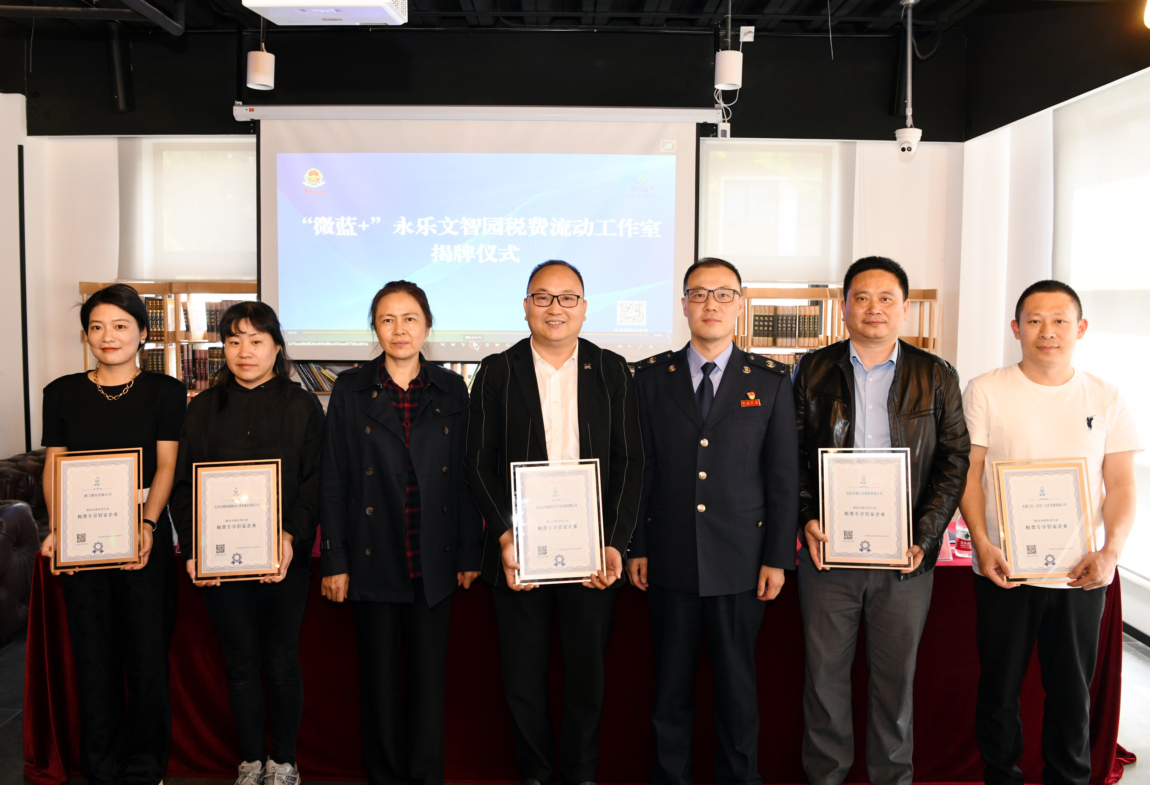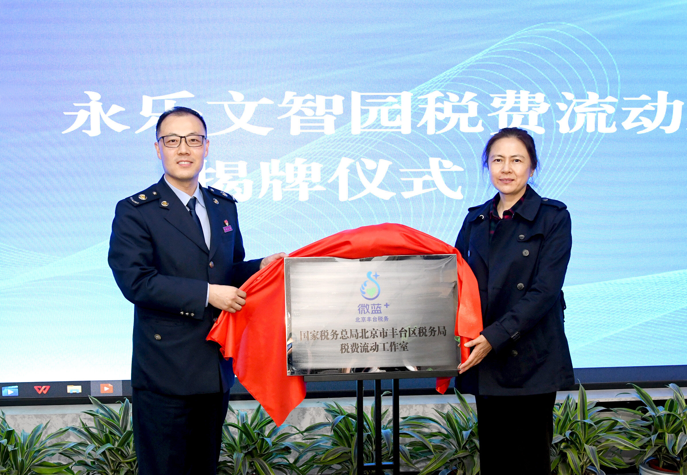 近日,国家税务总局北京市丰台区税务局第6家税费流动工作室——“微蓝+”永乐文智园税费流动工作室在永乐文智园成立,该局党委委员、总经济师张瑛,新村街道副主任申桂萍和永乐文智园总经理黄玲海共同为工作室揭牌。