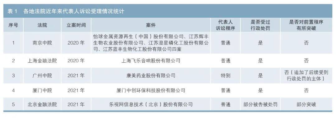 2019年后,已有多家法院对代表人诉讼机制进行了有益探索,多数案件仍具备处罚前置要件。北京金融法院于2021年受理的乐视案,将同一证券侵权事实中涉及的未被处罚的主体列为案件的共同被告,且该案中并无行政处罚的前置条件。表1为笔者整理的近年来代表人诉讼受理基本情况。