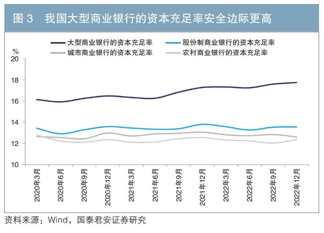 与国外银行AT1债券相比,我国银行永续债的减记风险较小。从发行主体来看,我国银行永续债的发行主体主要为国有大型商业银行以及股份制商业银行,这些银行整体资产规模大、实力雄厚,破产重整风险小。从资本充足率来看,一方面,我国对商业银行的监管要求较高。根据《商业银行资本管理办法(征求意见稿)》(以下简称《办法》),我国商业银行的资本充足率监管要求比《巴塞尔协议Ⅲ》的要求略高,其中核心一级资本充足率、一级资本充足率和资本充足率(不含缓冲资本)分别为不低于5%、6%和8%,而《巴塞尔协议Ⅲ》的监管要求分别为不低于4.5%、6%和8%。另一方面,我国银行资本充足率较高。截至2022年末,我国大型商业银行的整体资本充足率为17.76%,股份制商业银行的整体资本充足率为13.57%,大型商业银行的资本充足率安全边际比股份制商业银行高(见图3)。此外,我国尚未出现银行永续债减记情况。