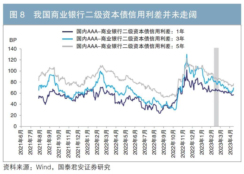 我国银行体系整体较为稳健,具有AT1债券属性的银行永续债发行主体集中在违约和减记风险均较小的国有大型商业银行以及股份制商业银行。瑞信AT1债券全额减记事件对我国银行永续债的影响较小,我国银行永续债及二级资本债的信用利差在该事件发生前后并未明显走阔(见图7、图8),欧美银行体系风险事件对我国银行业的外溢影响极为有限。