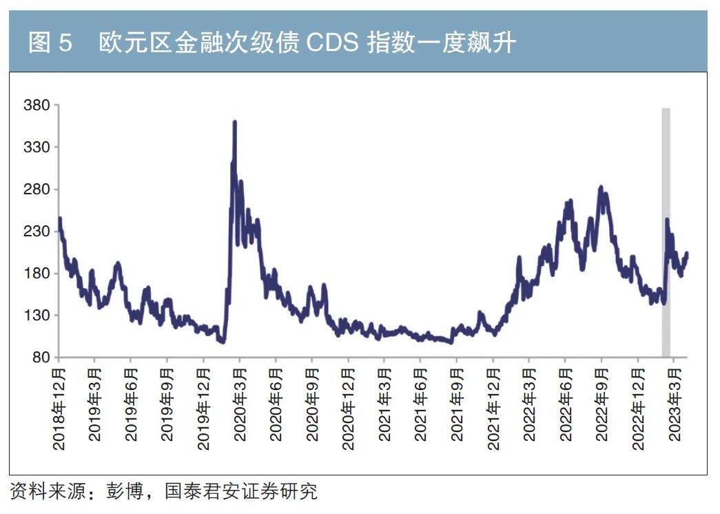 瑞信AT1债券全额减记符合合同条款和瑞士监管要求,且在瑞士联邦政府提供流动性援助的情况下,瑞银对瑞信的收购有力地避免了欧洲银行业风险的进一步发酵。但瑞信AT1 债券全额减记对欧洲包含AT1债券在内的CoCos债券市场形成巨大打击(见图4),并迅速殃及欧洲各主要金融机构的股价以及全球银行资本工具市场,欧元区金融次级债的信用违约互换(CDS)指数一度飙升(见图5)。从彭博欧洲银行AT1债券基准指数来看,该指数自2023年2月初的阶段性高点下跌超22%至2023年3月20日的低点(见图6)。随着英国央行声明ATI债券受偿顺序优先于普通股一级资本(CET1),欧洲央行、欧洲银行管理局(EBA)等发表声明重申普通股作为核心一级资本将首先吸收损失并暗示瑞信是特例后,海外AT1 债券市场情绪逐渐企稳。2023年3 月21日,彭博欧洲银行AT1债券基准指数回升近5%。截至2023年5月3日,该指数已自低点累计回升近10%。