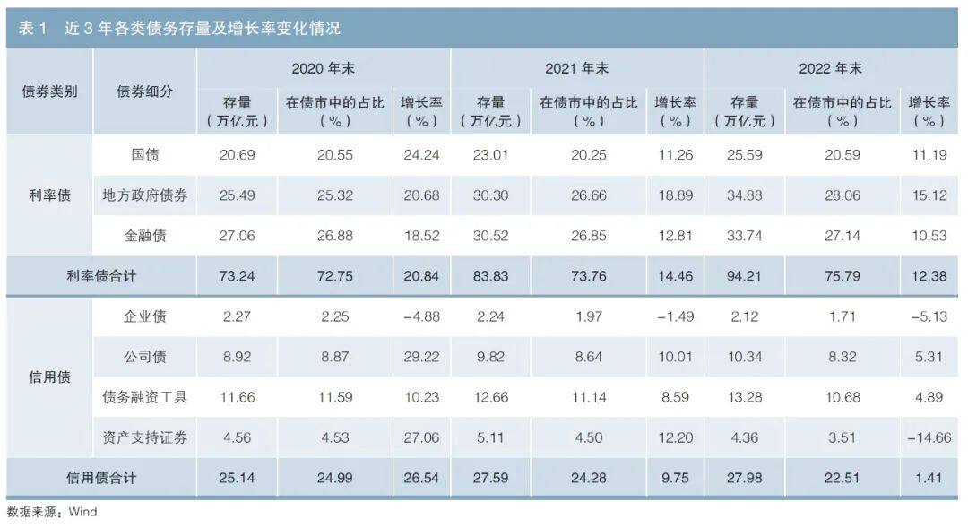 根据万得(Wind)的统计数据(下同),截至2023年7月12日,从广义角度来看,我国债市总规模达147.15万亿元。其中,利率债占较大比重,存量为87.69万亿元,占比为59.59%;信用债位居第二,存量为45.11万亿元,占比为30.65%;同业存单位居第三,存量为14.36万亿元,占比为9.76%。从趋势来看,2020—2022年,利率债和信用债各子券种存量虽然有所增长,但是增速均在下降,其中地方政府债券存量增速下降较缓,在债市中的占比从25.32%提升到28.06%(见表1)。
